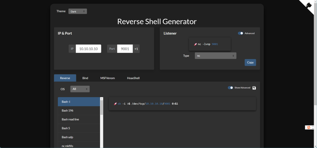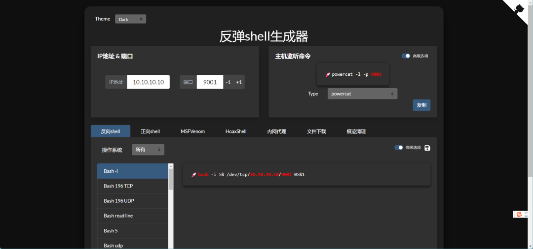 https://github.com/0dayCTF/reverse-shell-generator生成通用监听器和反向 shell