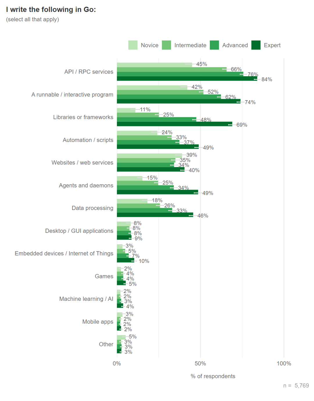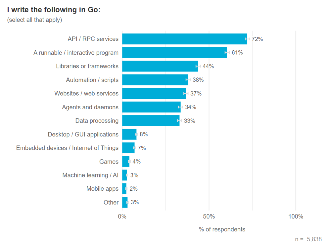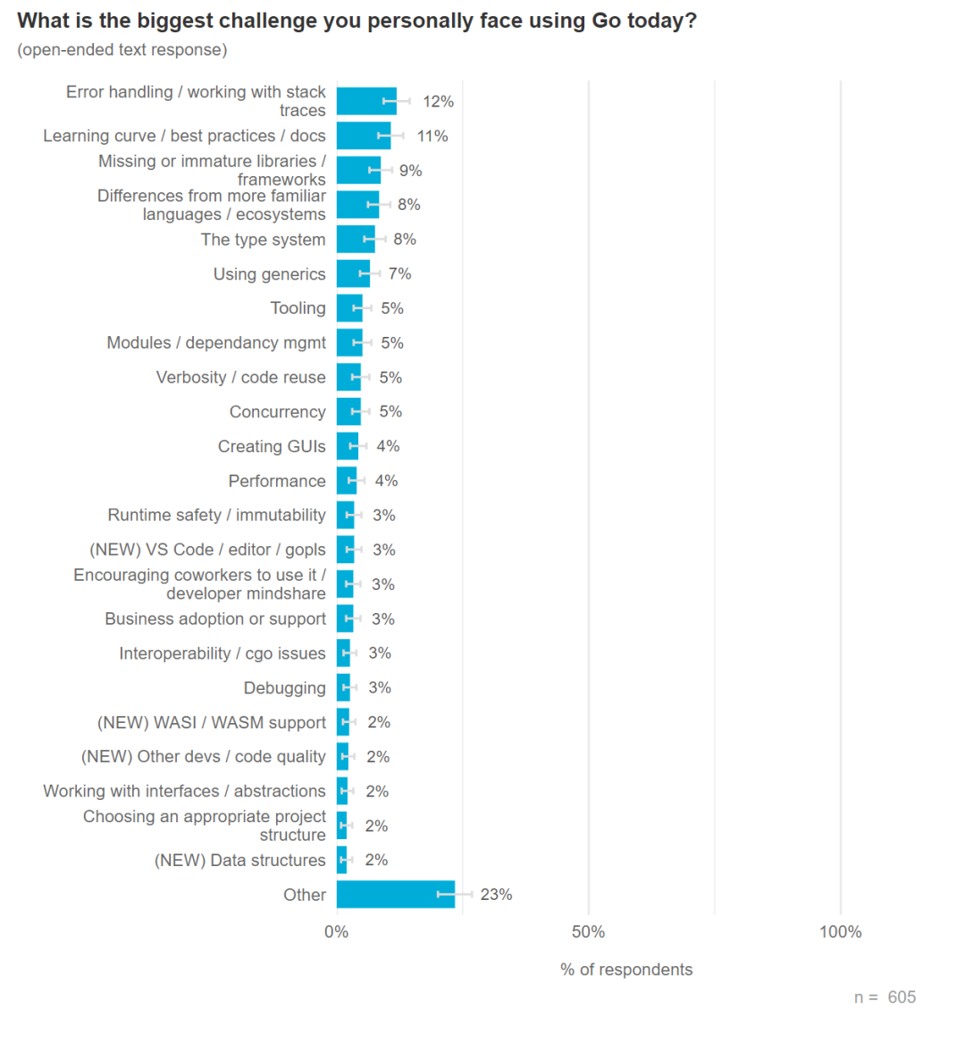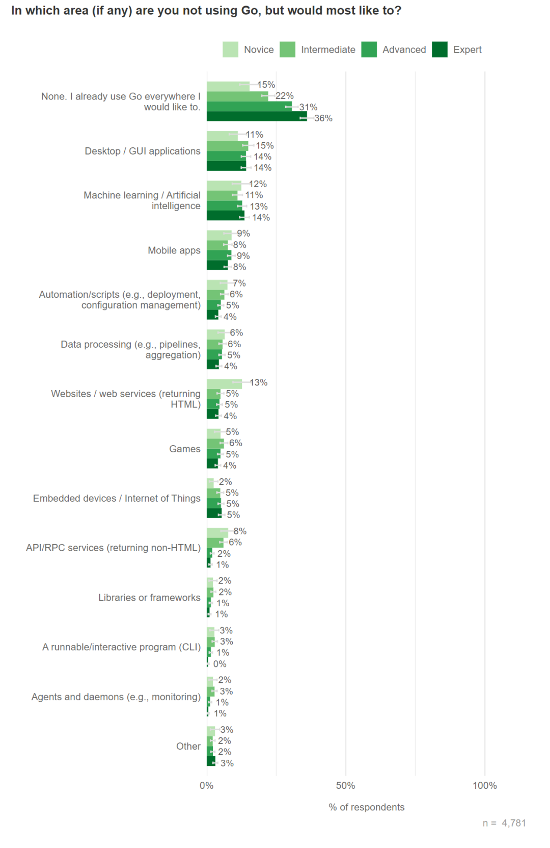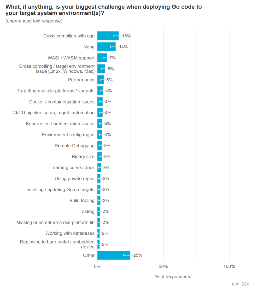 经验丰富的 Gophers 倾向于将 Go 用于更多类型的应用程序。例如,专家至少在四个领域使用 Go,而新手仅在两个领域使用 Go。不过无论如何,构建 API/RPC 服务和编写 CLI 仍然是两个最常见的用例。GUI 和 Website / Web services (returning HTML) 方面也展现了一些有趣的趋势。所有经验水平的人都以大致相同的速度将 Go 应用于 Desktop/GUI 应用程序。“这给了我们证据,对 GUI 的渴望不仅来自寻找有趣的入门项目的新 Gophers,而且来自整个行业。”Websites /services returning HTML 也显示出了类似的趋势。报告认为,一种解释可能是这是某人 Go 之旅早期的常见用例(因为它是新手最常见的前 3 名),或者新手更有可能在 websites or web services returning HTML 上工作。在被问及 “想使用但还没有使用 Go 的领域” 时。有 29% 的受访者表示,他们已经在任何所想的领域使用了 Go 语言,但扩大使用量的前两个领域分别是 GUI / Desktop 和 AI / ML 应用;且在不同组织规模和工作角色的群体中都是这样。但就经验水平而言,新手更愿意使用 Go 的第一个领域是 websites /web services returning HTML。报告还指出,在一个开放性文本问题中,29 名受访者中有 12 名表示希望将 Go 用于 websites /web services returning HTML;而他们没有付诸行动的原因是,其他语言有框架可以更好地支持此用例。可能是更有经验的 Go 开发人员不会尝试或期望将 Go 用于此用例,而其他语言已经拥有满足这些需求的框架。“用其他语言(如 PHP 或 Ruby)通常更容易做到这一点。部分原因是这些语言中存在的优秀框架。”此外,新手对 Web 开发感兴趣的另一个解释可能与他们使用 JavaScript / TypeScript 有关。新手比更有经验的受访者花更多的时间用 JavaScript / TypeScript 写作。对 Web 的较高兴趣可能与新手受访者目前使用其他语言的工作有关,或者可能表明对 Web 技术的普遍兴趣。“将来,我们希望了解有关此用例的更多信息,以及如何帮助新 Gophers 在对他们最有用的领域开始使用 Go。”“易于部署” 通常被认为是 Go 的一大优势,但在最近的一项研究中,Go 团队收到了一些相互矛盾的反馈,“这促使我们在部署 Go 代码时探索潜在的问题”。在开放式文本回复中,目前为止所反馈的最常见的问题是:难以与 cgo 交叉编译(16%),其次是对 WebAssembly 或 WASI 的支持(7%)。新手 Go 开发人员比其他经验水平的受访者更喜欢 Web 开发。这是 Go 团队想要进一步探索的领域,以确保满足新的 Go 开发人员的需求。