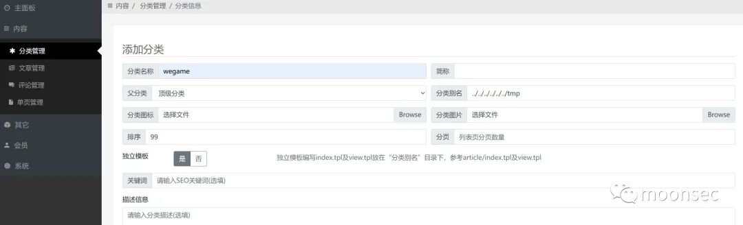 分类管理-添加分类,分类别名设置为:../../../../../../tmp