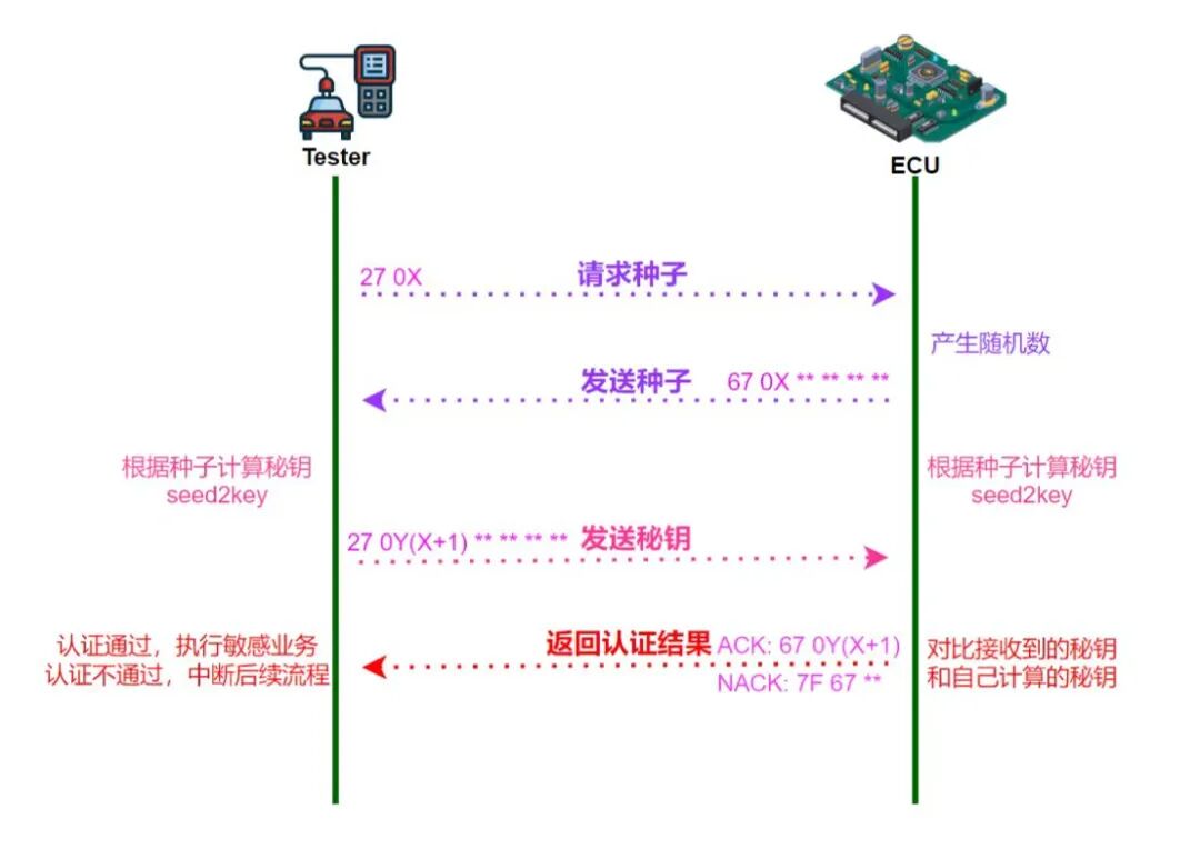 Send Key Reply : ECU 将收到的 Key 和 自己拿 Seed 作为输入的 Seed2Key 计算出结果进行对比,然后返回验证的结果。