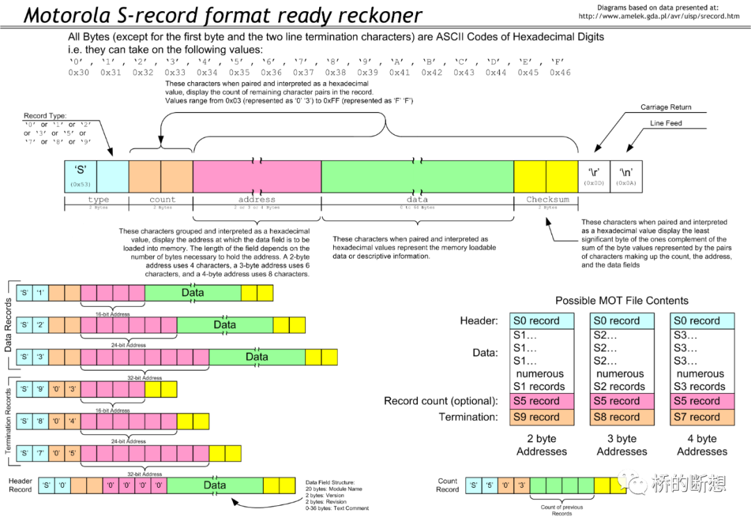 S-record 是摩托罗拉设计的一种常于MCU内存、EPROM、EEPROM 写入的文档格式,S-record 将二进制数据以ASCII字符表示。常用文件后缀名有 SRECORD、SREC、S19、mot。文件格式如下图。