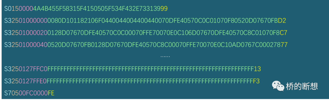 S0 Record(头记录):记录类型是“S0”。地址场没有被用,用零(0x0000)填充。数据场中的信息使用HEX转换成字符串是:JKE_X1_APP_SOC.s19。此行表示程序的开始,不需烧入内存,用来表述文件的相关信息,可能包含文件名、版本号等。