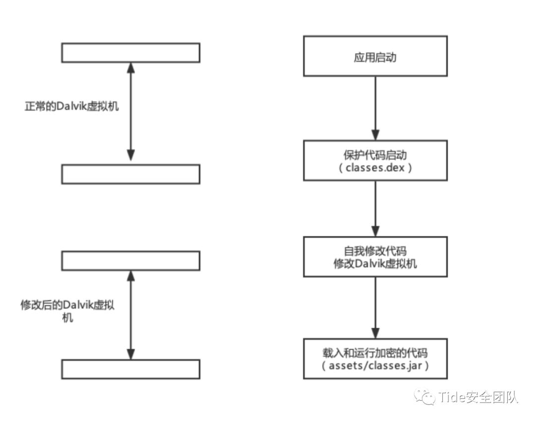 dex文件整体加壳的基本原理是对classes.dex这个文件进行整体加密,将加密后得到的文件 存放在apk文件的资源文件中,并在App运行时将加密后的classes.dex文件在内存中进行解密,再让Dalvik虚拟机动态加载解密后的原始clases.dex文件并执行。 对dex文件整体加壳的加固流程如图所示。