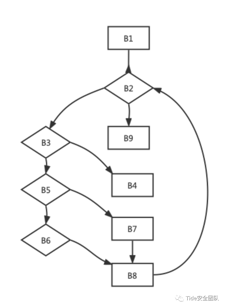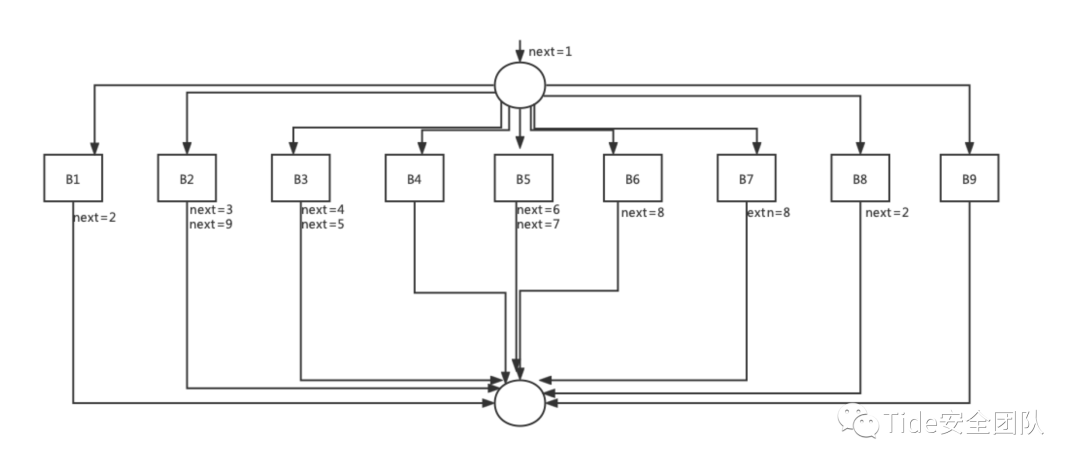 为了方便进行控制流表示,我们对上面的代码里的基本块进行了标注,分别为B1, B2,...,B9。以上示例代码的程序控制流图如下图所示。