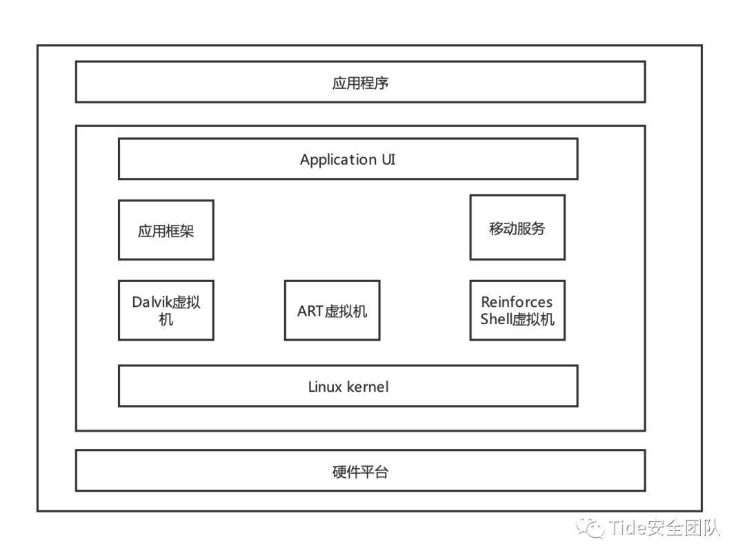 经VMP加固的App,其中未做指令保护的方法还是以正常的字节码的形式由Dalvik/ART虚拟机执行,而经指令保护后的方法则由自定义的虚拟机执行。对于攻击者来说,即使通过内存转储等动态分析方法拿到了自定义的字节码,还需要分析和理解自定义的字节码格式,因此攻击者逆向这种自定义虚拟机的成本会大大增加。另一方面,VMP加固也是基于方法的虚拟化保护,可以针对一一个App构建多个不同虚拟化的解释引擎,对App中不同的方法采用不同的虚拟化执行引擎,通过增加虚拟机异构特性的实现方式进一步提高App的安全防护能力。VMP加固技术中的虚拟机如图所示。