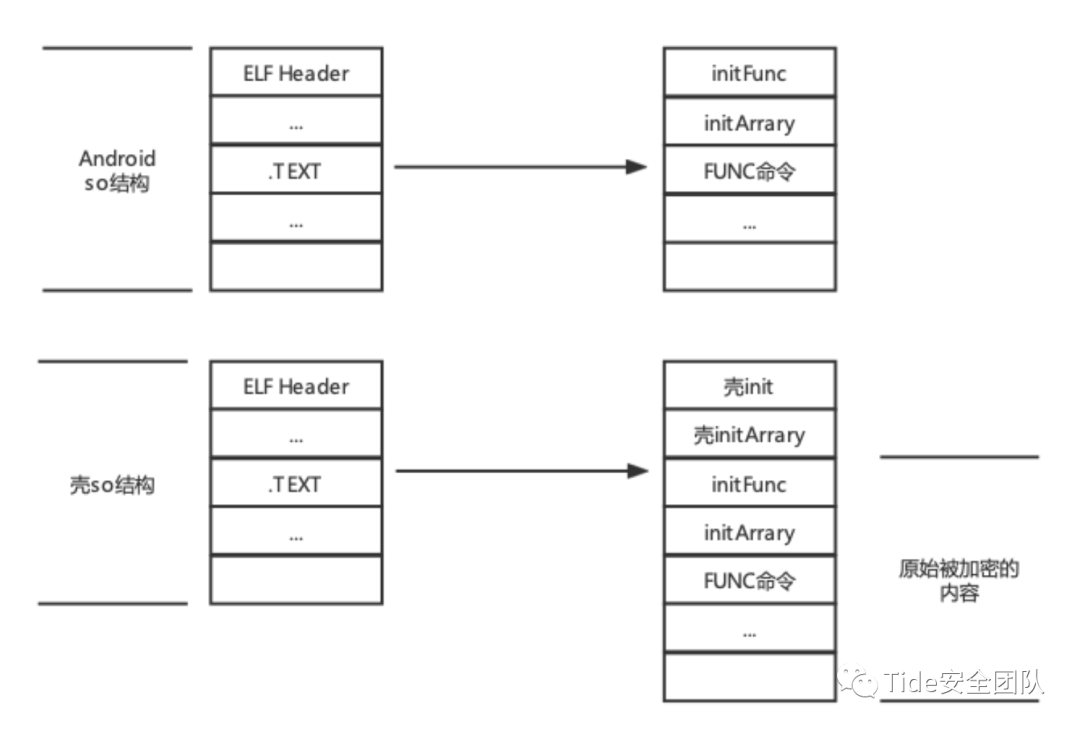 so文件的加密保护护技术与PE文件的加壳技术类似。加壳技术是指利用特殊的算法,将可执行程序文件或动态链接库文件的编码进行改变, 以达到加密程序编码的目的, 阻止IDA等反汇编工具的逆向分析,如图所示。