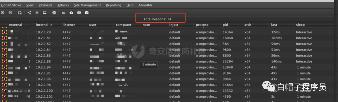 因为前面已经拿到了100多台机子的权限,所以能想到的第一个思路就是把100多台主机上的hash都进行一个抓起取,然后看是否可以抓到域管的账号,但是这里抓完之后会发现,没有一台域管是上线的,所以这里也比较无语。