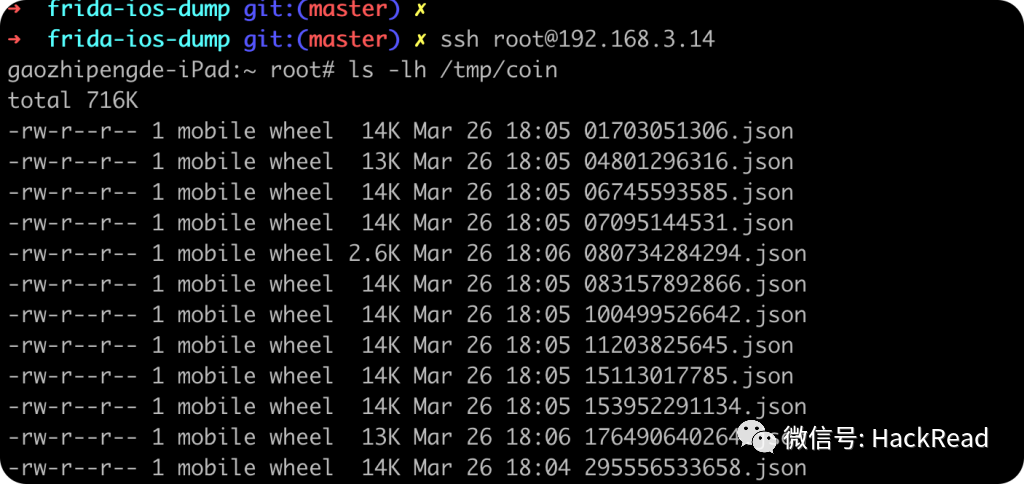 虽然修改代码和执行frida的命令是在mac上,但是脚本最终是在ios设备上执行的,所以frida代码中生成的文件也是在ios上。