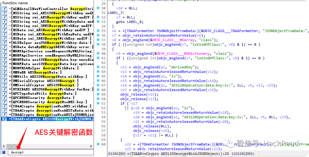 搜索decrypt关键字,很容易就定位到解密函数位置,从函数名就能看出是使用的AES加密,所以问题就简单多了。
