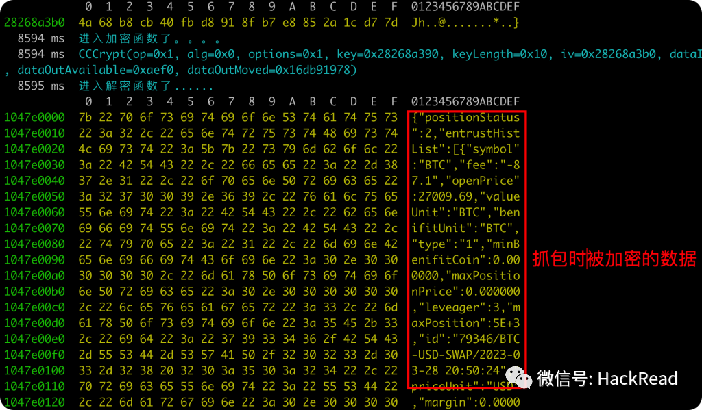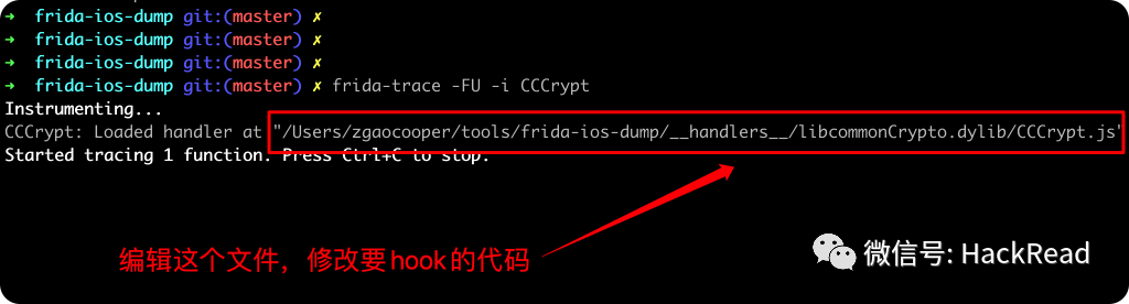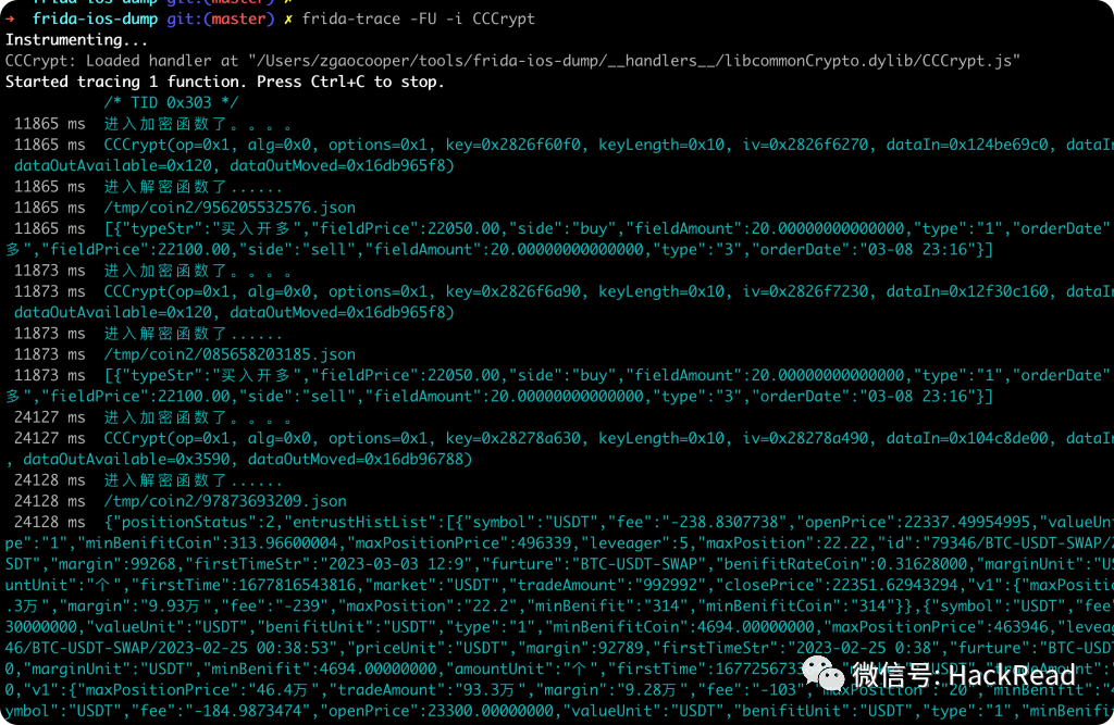 frida-trace -FU -i CCCrypt因为当前已经在前台运行了程序,所以就不用指定包名,直接hook即可。