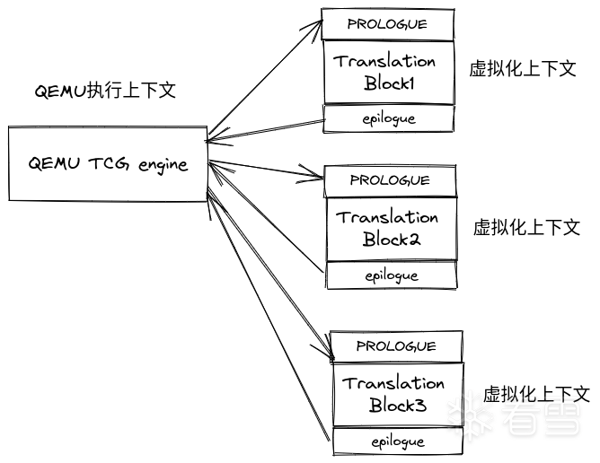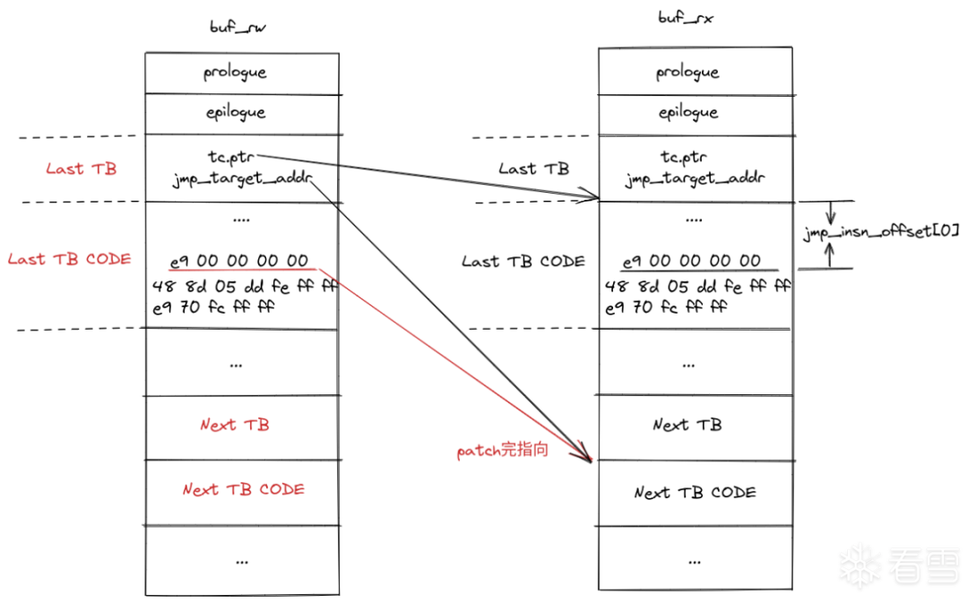 tcg_init_machineqemu_memfd_create()函数创建出一个匿名文件,该匿名文件的大小是根据当前Host机器的物理内存计算出来的,比如我的电脑是64G,最终计算出来的匿名文件大小为1G。(PROT_READ | PROT_WRITE),称之为buf_rw。(PROT_READ | PROT_EXEC),称之为buf_rx,buf_rw和buf_rx之间的差值由全局变量tcg_splitwx_diff表示。tcg_init_machine函数还会调用tcg_target_qemu_prologue函数创建出对应于Host的prologue和epilogue,并且分别由全局变量tcg_qemu_tb_exec和tcg_code_gen_epilogue指向(如上图)。//保存callee需要保存的寄存器