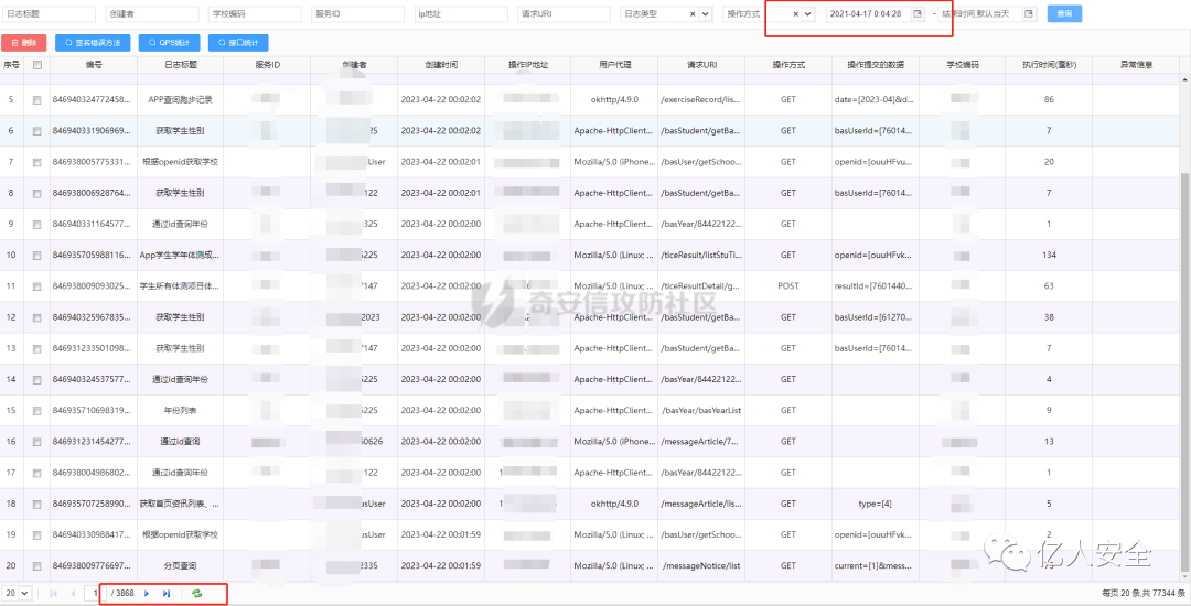 此时可以发现这个疑似是直接访问到了全部用户的日志,选择时间较早一些,可看见数万条日志,而后我们这里发现有很多可填的地方,我们尝试在创建者处添上admin,在日志类型处选择登录日志