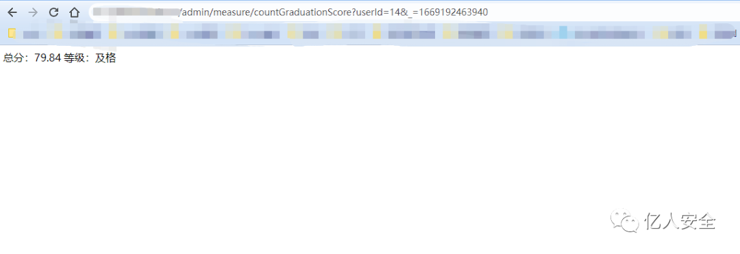 查询成绩处,这个接口是admin/measure/countGraduationScore?userId=10&_=1669192463940,发现参数userid,更改参数值即可查看其他人成绩