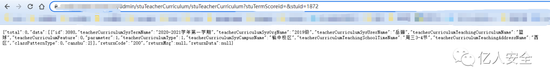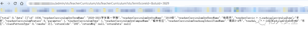 查询课表处,这个接口是admin/stuTeacherCurriculum/stuTeacherCurriculum?stuTermScoreid=&stuid=3829,此时可以发现存在参数stuid,更改此参数后可以查询不同学生的任课教师和对应课程信息