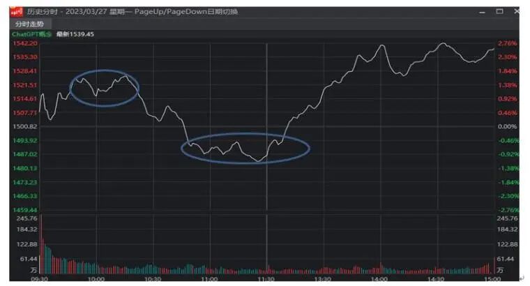 1、CHATGPT日内分时,看图中两个圆圈,为日内的分时分歧点,和修复点。这是能够帮助你日内买卖操作,做T操作的。如果你但看这一个指数分时,累死你,也找不到分时情绪的转折点,结合上证指数、结合板块内主要的核心个股,想找到不难。