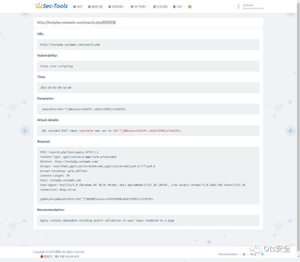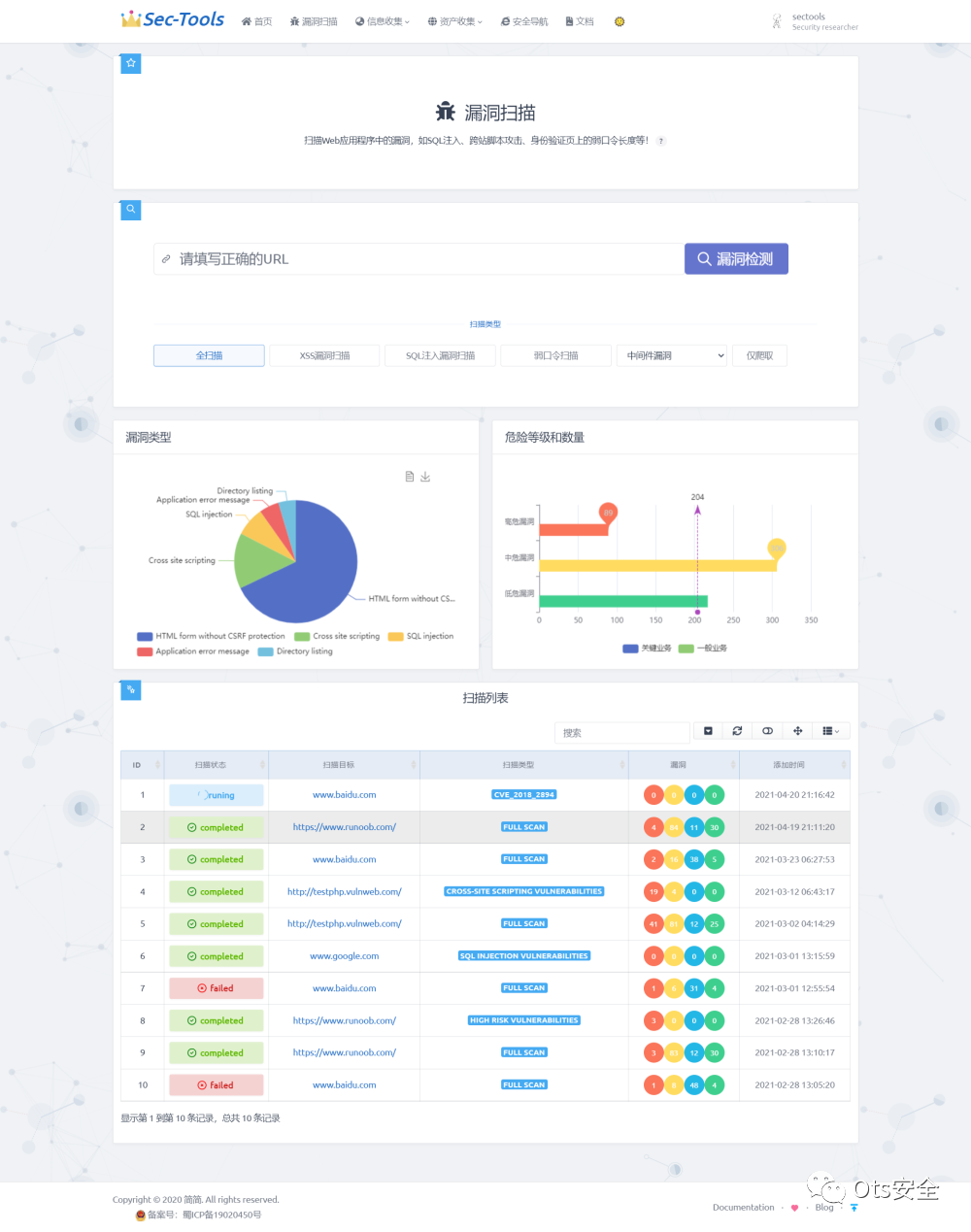 本项目命名为Sec-Tools,是一款基于 Python-Django 的多功能 Web 应用渗透测试系统,包含漏洞检测、目录识别、端口扫描、指纹识别、域名探测、旁站探测、信息泄露检测等功能。