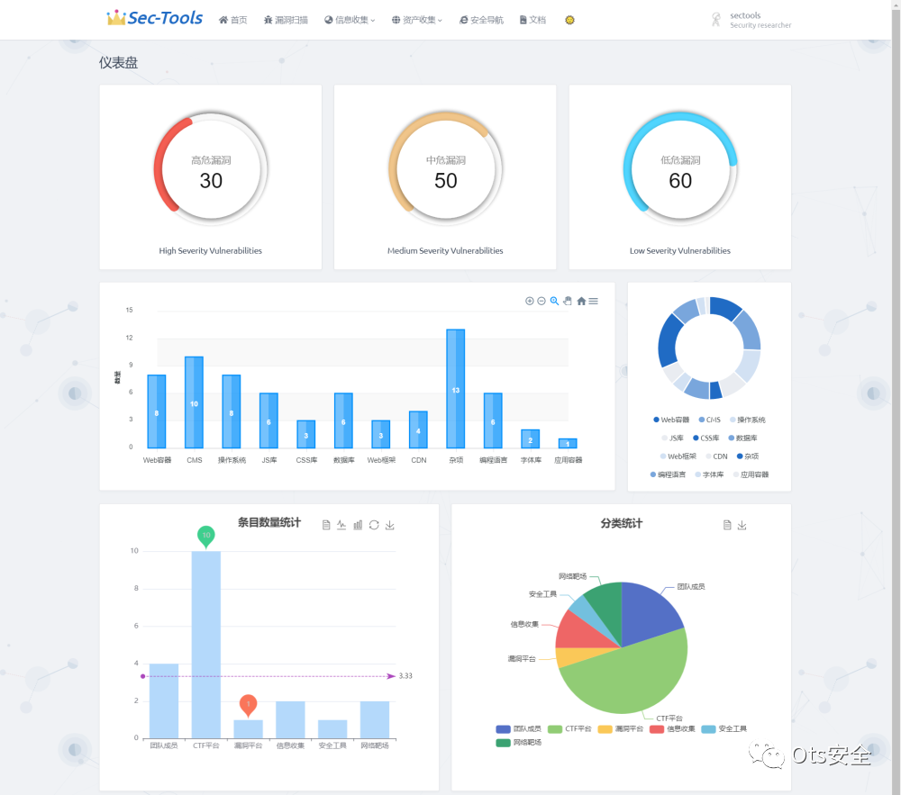 首页采用 ECharts 对漏洞扫描的漏洞等级、指纹识别组件、安全导航数据做了可视化图表展示,图表的风格没有统一,凑合看吧