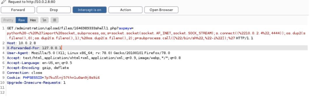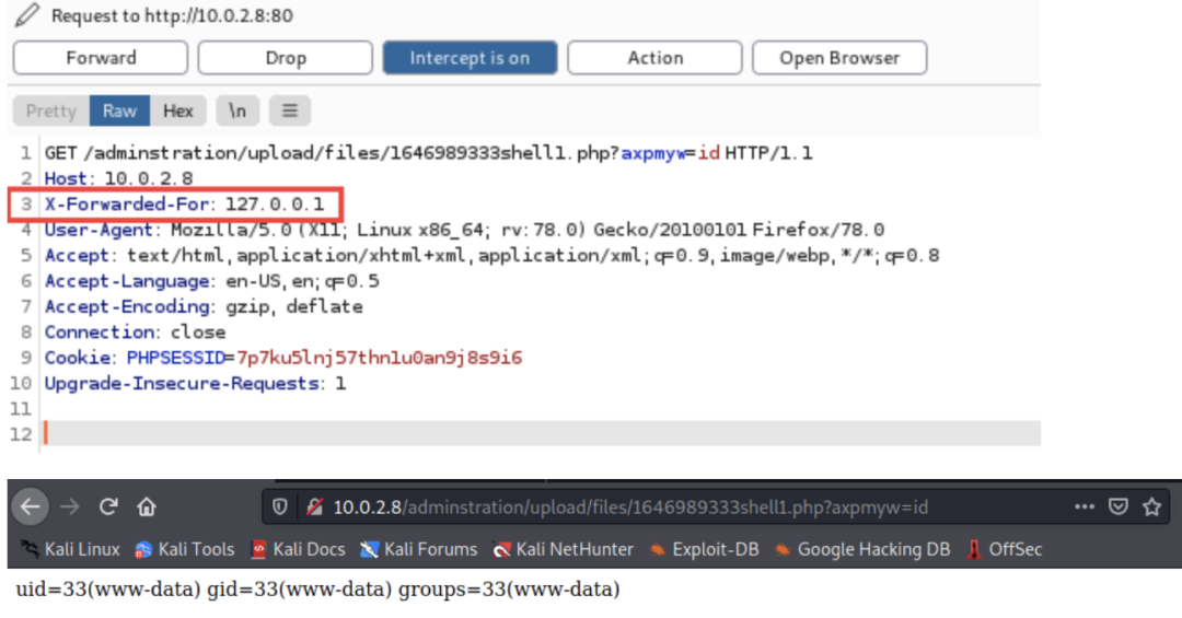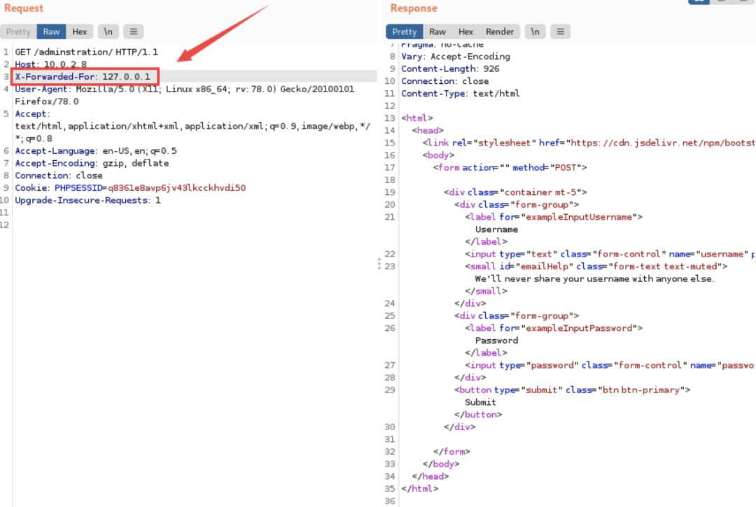 修改数据包头部,添加X-Fprwarded-For让目标靶机认为这个请求是来自他自己的请求