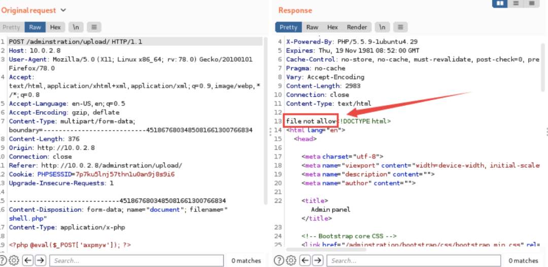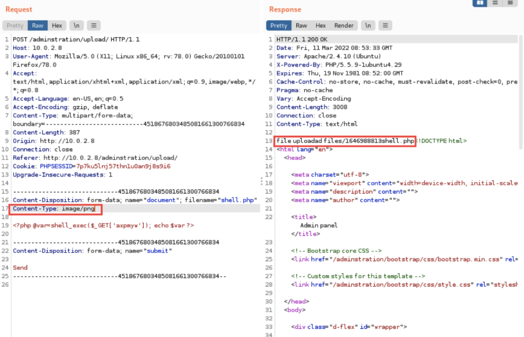 发现目标靶机有限制,不允许上传,尝试绕过限制,经过测试当修改Content-Type时可以上传成功。