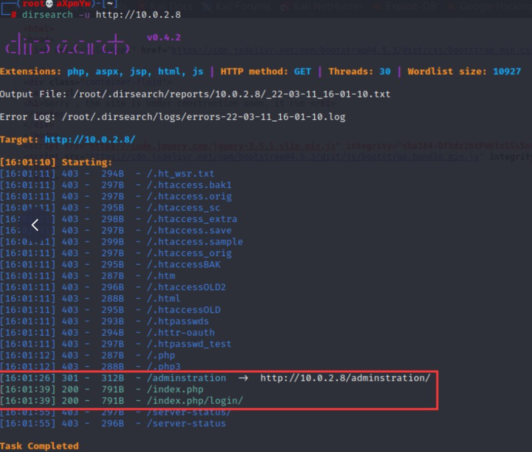 出现很多403响应码表示拒绝访问,经过测试/index.php和/index.php/login/仍是主页,但是有一个路径/adminstration,尝试访问。