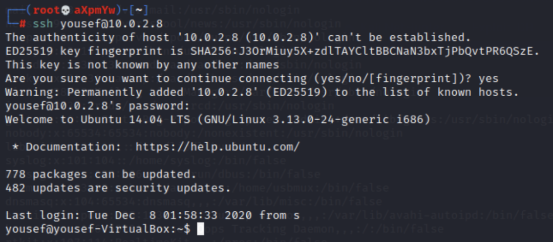 pass : yousef123提示ssh的用户名和密码,ssh登录。