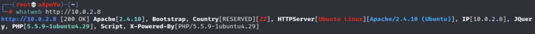 whatweb http://10.0.2.8Apache后端web服务,Bootstrap前端框架,系统是Ubuntu,使用的语言是PHP-5.5.9。