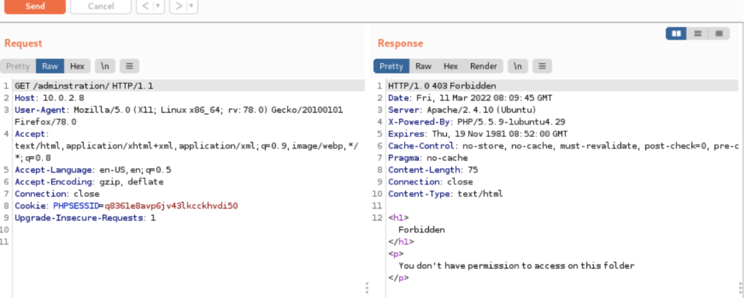依旧是拒绝访问,说明这个地址是存在的,但是我们的权限很低没有办法访问,这个说明目标靶机的管理员做过权限控制,但是很多时候管理员做的权限控制很存在安全隐患,我们尝试是否可以绕过403授权限制。