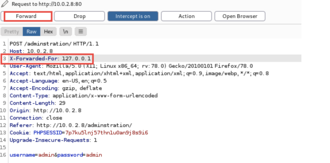 我们尝试登录,最终经过测试目标靶机存在弱口令admin,admin,继续burp suite抓包,每一个包都加上X-Forwarded-For: 127.0.0.1,然后forward。