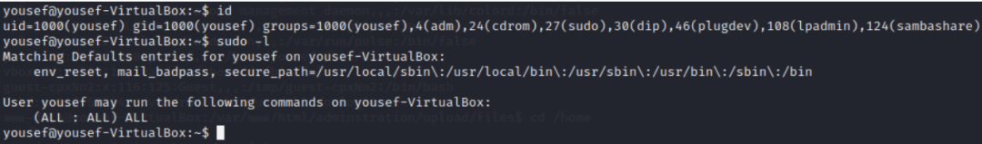 通过查看id发现youser账号可以执行sudo命令,而且可以运行这个靶机上的所有程序。