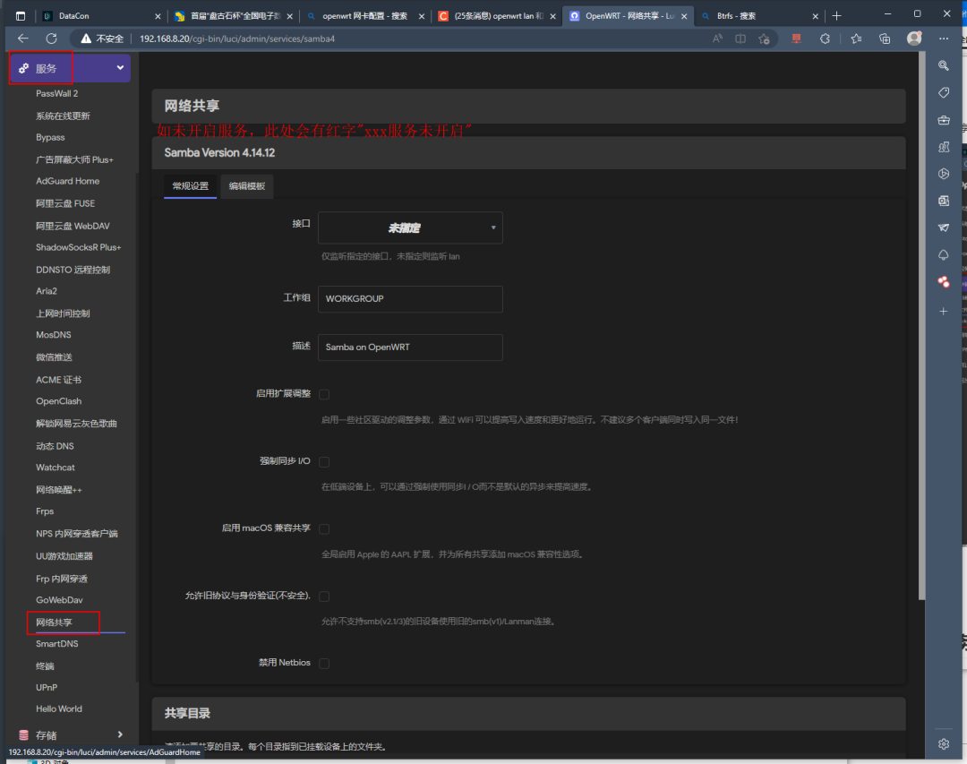 问共享路径,那么要找共享服务,储存选项处的共享服务并没有开启