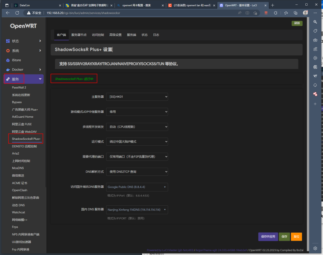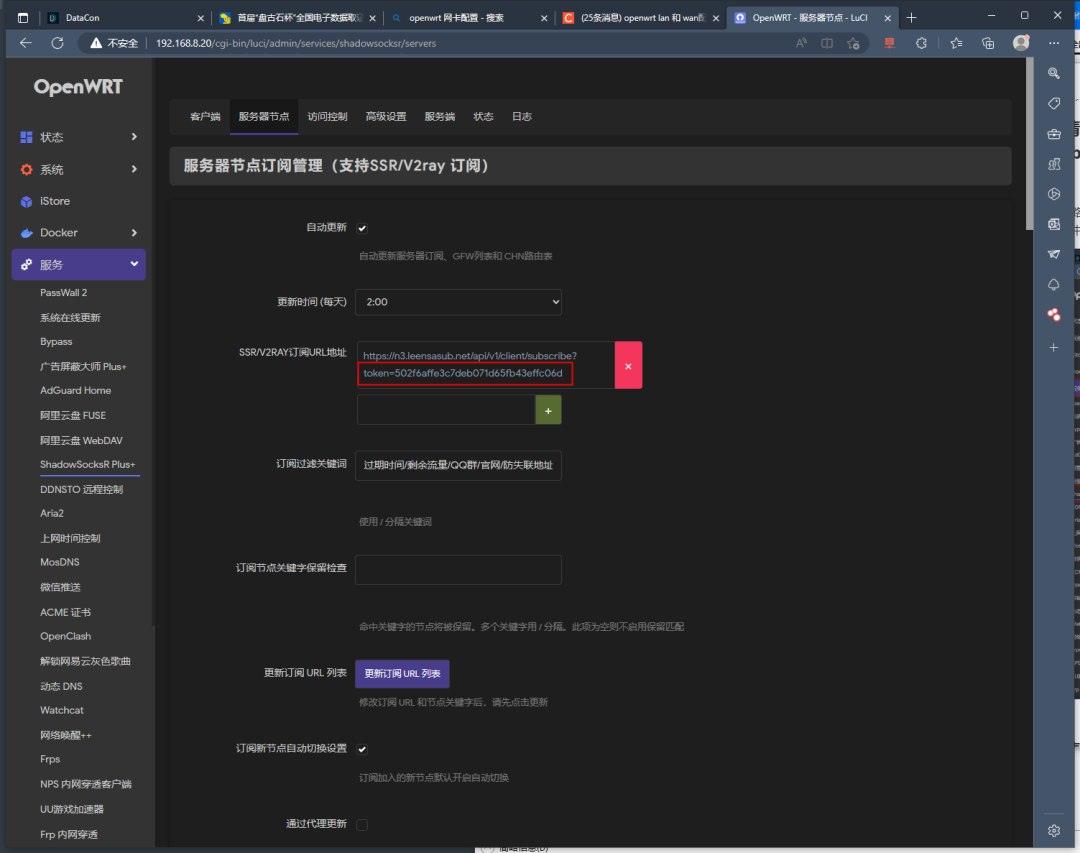 该软路由服务列表中其实存在多个代理程序,但是只有这个名为ShadowSocksR Plus+的正在运行且配置了链接,链接中含有token