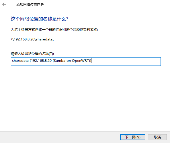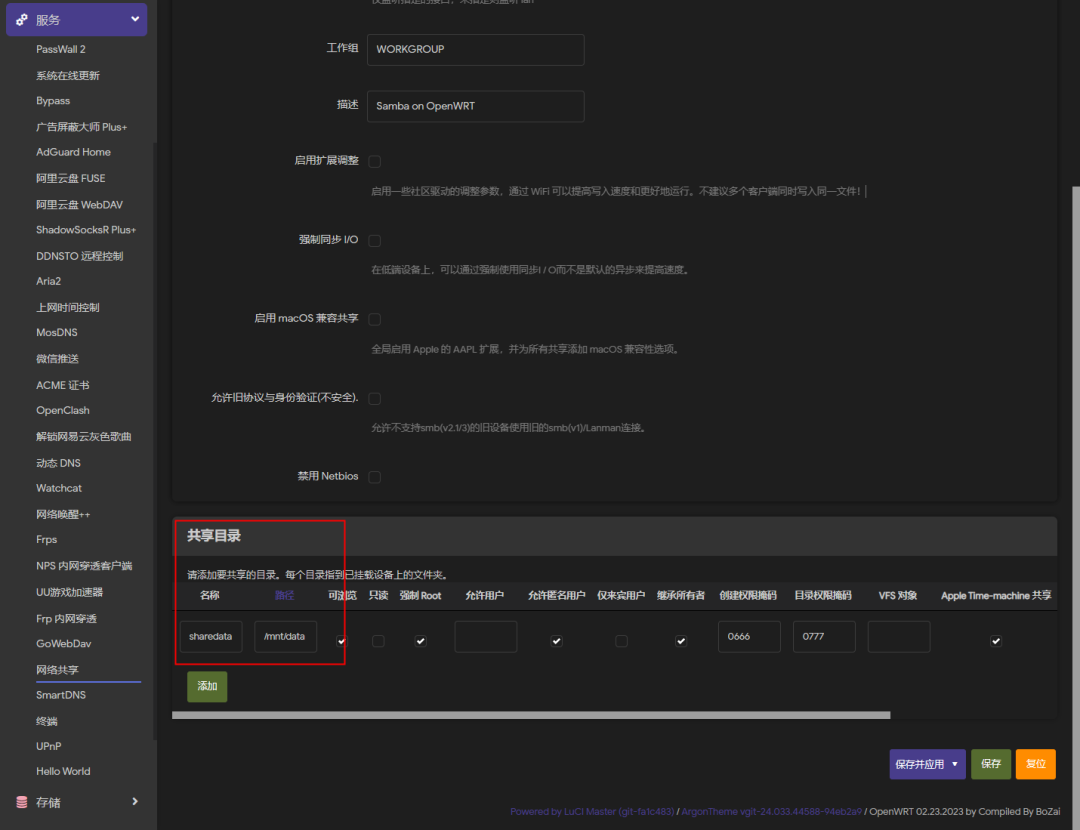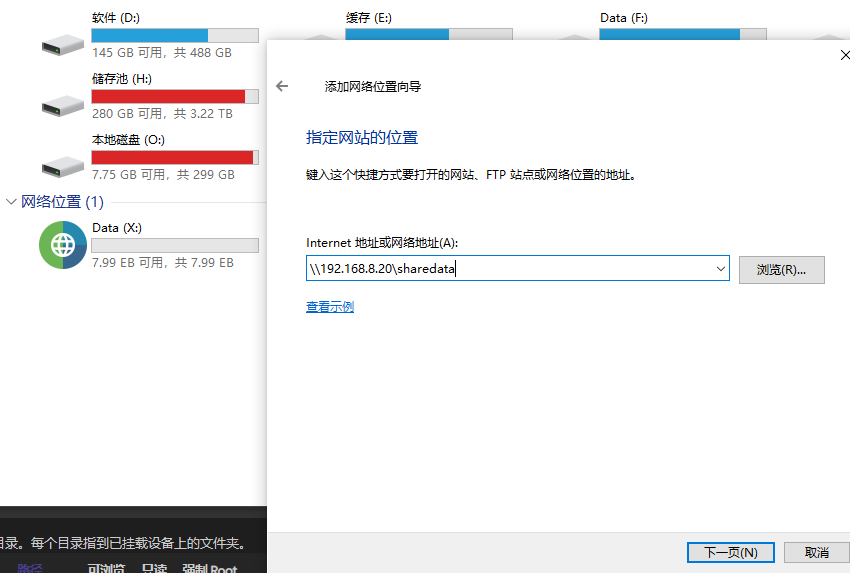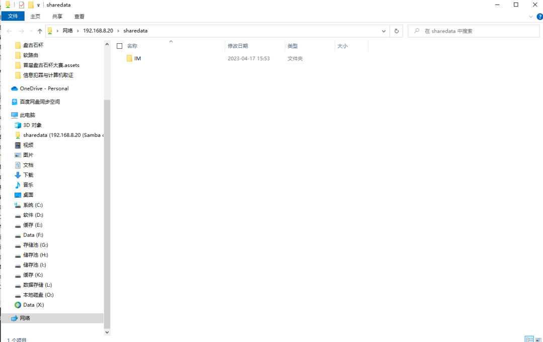 在服务->网络共享中,该服务开启,共享了名为sharedata的目录,其路径为/mnt/data