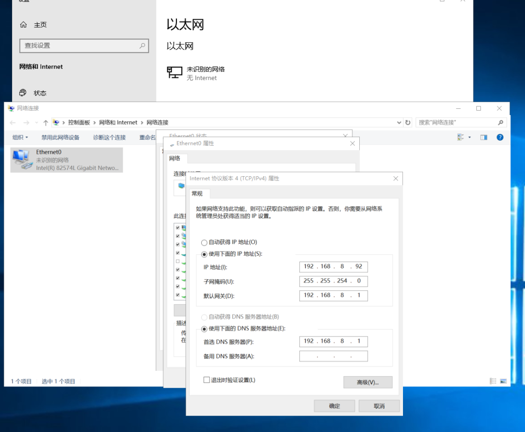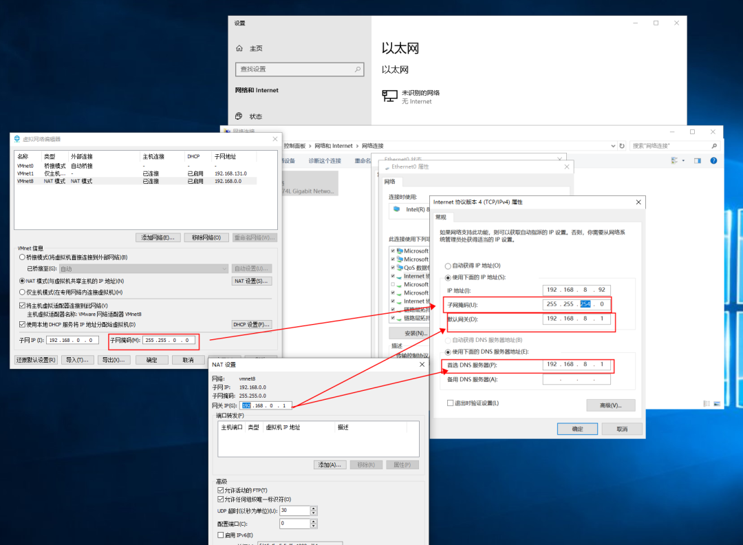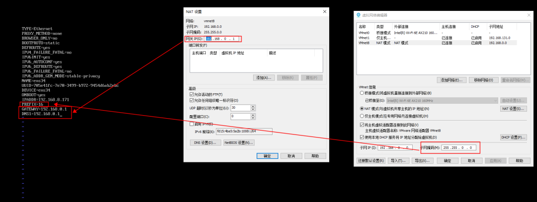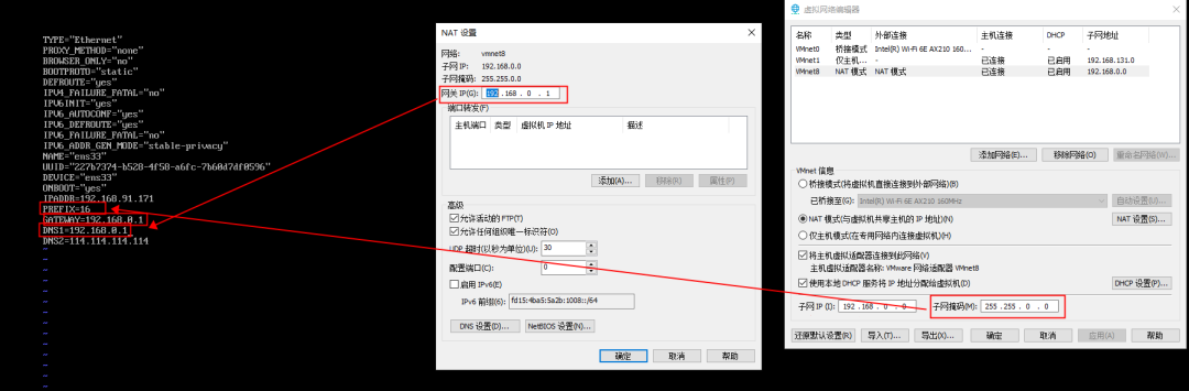 先进行网络设置,对原始网络进行记录,并将网络配置修改为我们虚拟机当中与虚拟网络编辑器配置相匹配的设置