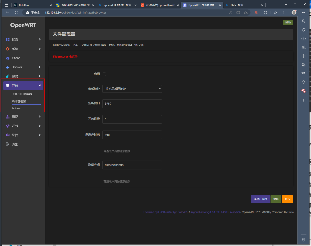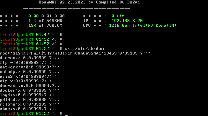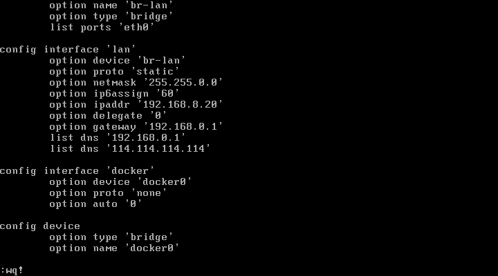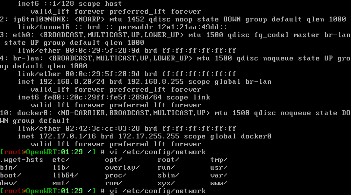 查看现在的配置,可以看到br-lan网卡为192.168.8.20/24,同开头进来显示的IP一样,实际上玩过openwrt的知道这个IP就是第一题,他的管理IP