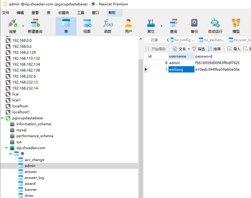 绕过登录密码,数据库中admin账号无法直接解出且id为8,weiliang用户id为1且密码可以解出,为123456,直接使用weiliang用户登录后台