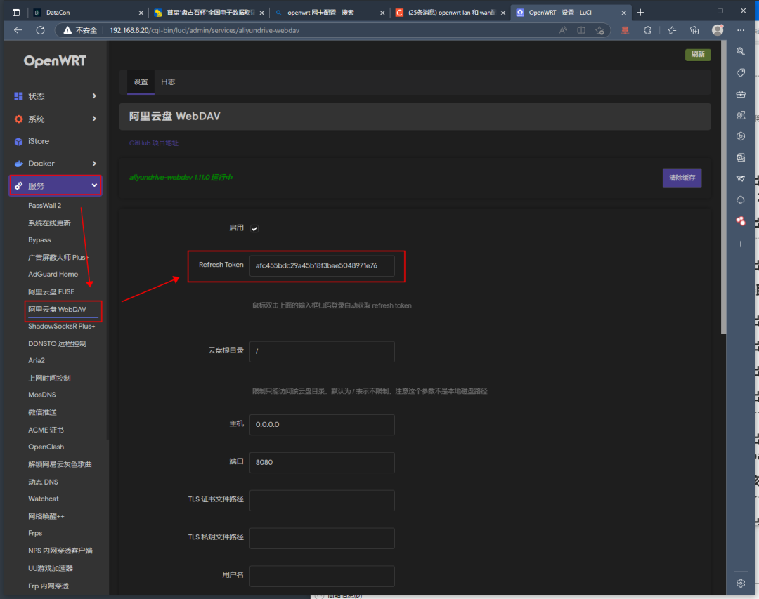 在 服务->阿里云盘WebDAV 可以看到token为afc455bdc29a45b18f3bae5048971e76