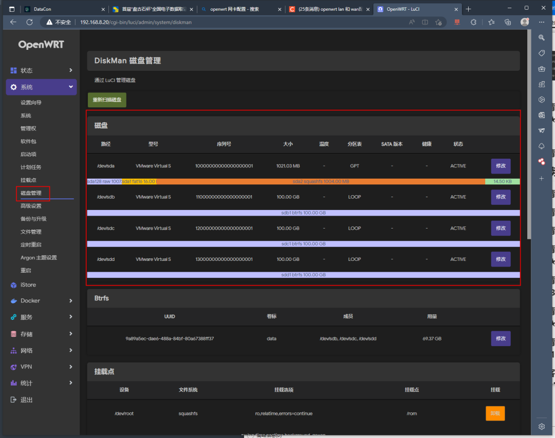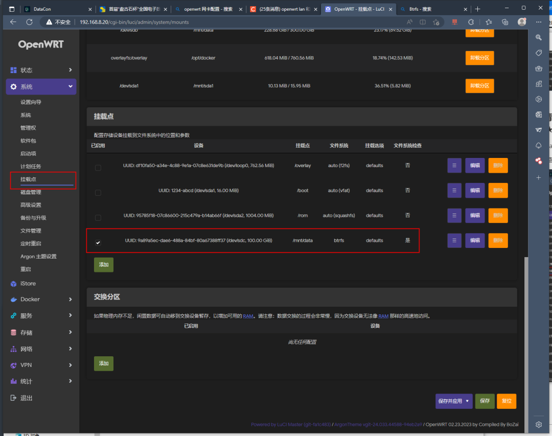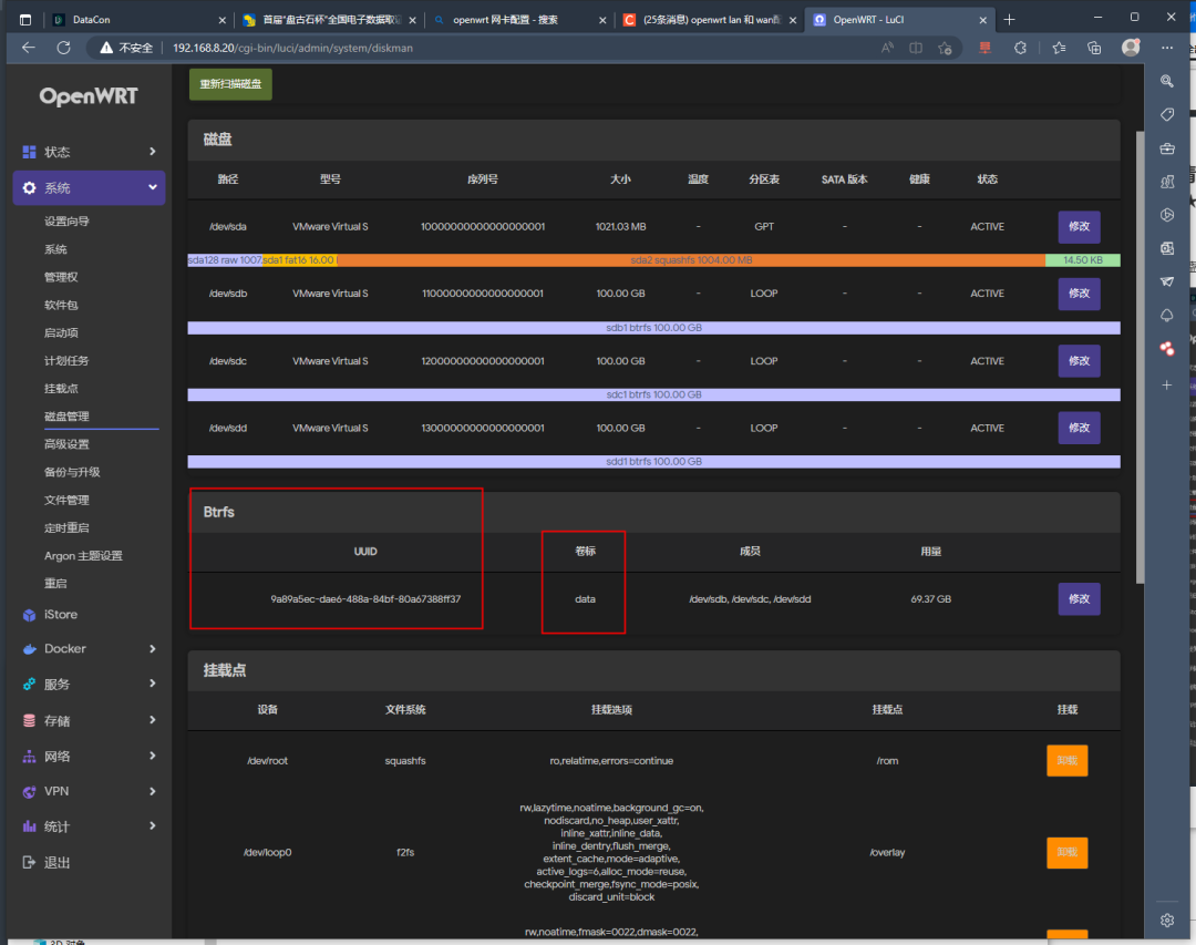 在挂载点选项,我也同样可以看到这个uuid为9a89a5ec-dae6-488a-84bf-80a67388ff37,挂载到了mnt下的data目录