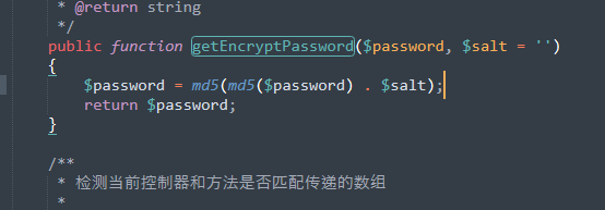 public function getEncryptPassword($password, $salt = ''){$password = md5(md5($password) . $salt);return $password;}
