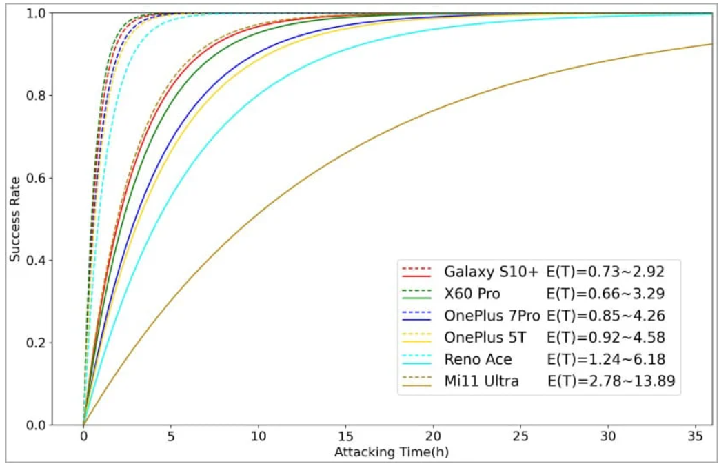 实验表明,如果设备中只录入了一份指纹,那么完成BrutePrint攻击所需的时间在2.9小时到13.9小时之间。如果目标设备中录入了多个指纹,那么暴力破解所需的时间会减少到0.66小时到2.78小时之间。