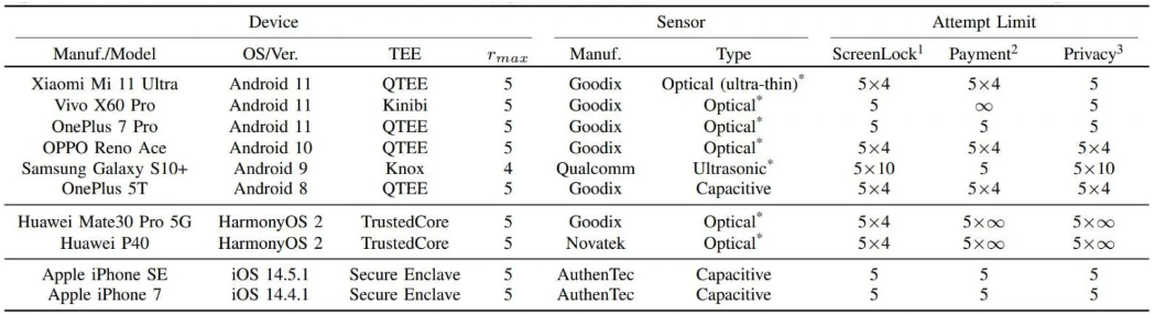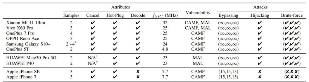 研究人员在10款主流智能手机上对BrutePrint和SPI MITM攻击进行了测试,并成功在所有安卓和鸿蒙设备上实现了无限制尝试次数,并在iOS设备上实现了额外的10次尝试。