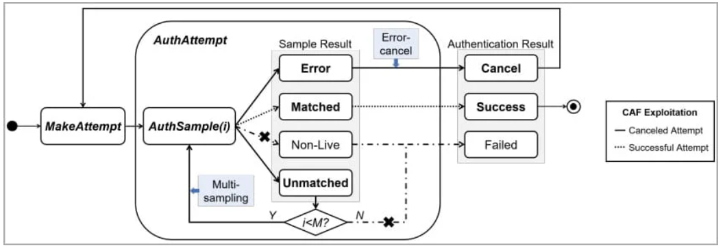 BrutePrint攻击位于指纹传感器与可信执行环境(TEE)之间,利用CAMF漏洞来操纵智能手机指纹认证的多点采样和错误取消机制。CAMF在指纹数据上注入一个错误的校验和以停止认证过程。因此,攻击者可以在目标设备上不断尝试指纹输入,但手机保护机制并不会记录错误的尝试次数,最终实现无限次的尝试。