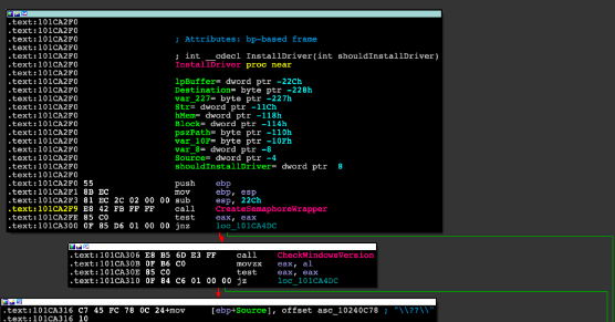 如果我们仔细观察InstallDriver,会发现它首先尝试创建一个semaphore,然后检查Windows版本。如果这些调用中的任何一个失败,它将退出而不执行任何操作。