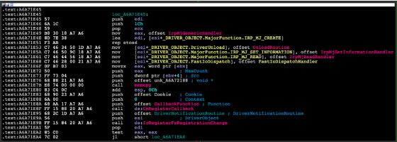 通过查看DriverEntry,我们可以看到两个主要的函数例程被分配了IRP_MJ_READ和IRP_MJ_SET_INFORMATION。此外,它还注册了两个回调函数——一个使用CmRegisterCallback,另一个使用IoRegisterFsRegistrationChange。