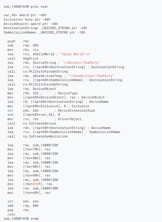 我们还可以使用wdm.h/ntddk.h中描述的IRP主要函数代码值,通过检查代码的主要函数,得出sub_140001280(在Snippet 2中)是IRP_MJ_CREATE的函数处理程序的结论,该代码将从DRIVER_OBECT结构中的MajorFunction(0x70)的偏移量得出0x70的结果。这显然是0x00*PointerSize(x64体系结构中为8);因此,正在处理的是IRP_MJ_CREATE。
