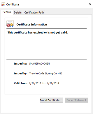 内核驱动程序由VMProtect打包,并使用颁发给“SHANGMAO CHEN”的证书进行签名(图4)。