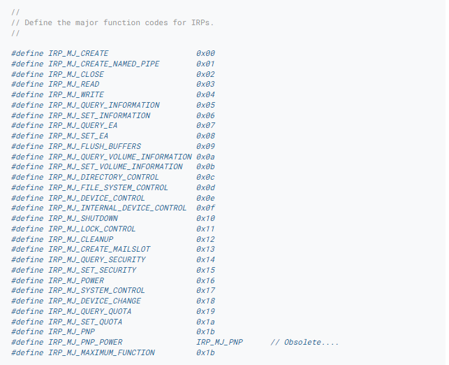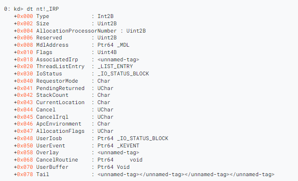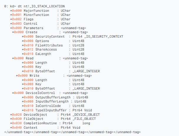 在进行分析时,我们熟悉的其他一些内核结构是IRP和IO_STACK_LOCATION结构。