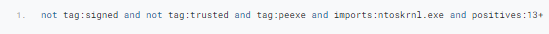 代码段11:查找恶意驱动程序的VirusTotal查询示例