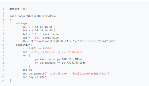 代码段12:一个搜索恶意驱动程序(也就是rootkits)的Yara规则示例