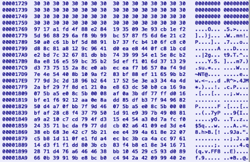 每个JPEG也有一个隐写有效负载,其形式是在多个0的分隔符之后,将数据连接到偏移量为0x1769的图片末尾(图10)。