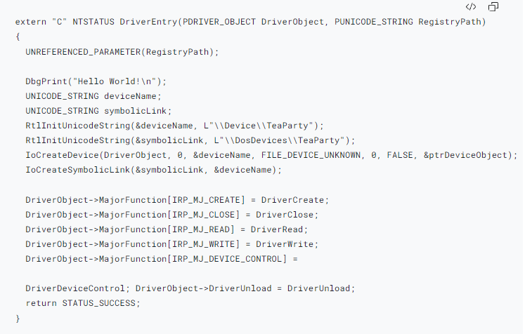以下片段(代码段1)展示了如何用C语言实现简单Windows内核驱动程序的DriverEntry。